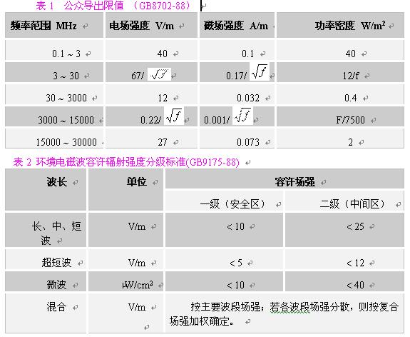 在對一般環境的電磁輻射分析中,應主要選用《環境電磁波衛生標準》主要選用《環境電磁波衛生標準》(GB9175-88),根據輻射源的主要輻射頻率,參照表2,找到其輻射強度限值。注意掌握三個標準限值,一般我們把居民居住的環境按一級安全區處理,則其標準限值為:在長、中、短波,電場強度應小于10V/m;在超短波段,電場強度應小于5V/m;在微波波段,其輻射功率密度應小于10μW/cm2?紤]到對在電磁輻射環境內工作人員的保護,我們建議在職業安全衛生領域,采用《電磁輻射防護規定》(GB8702-88)的相應限值。